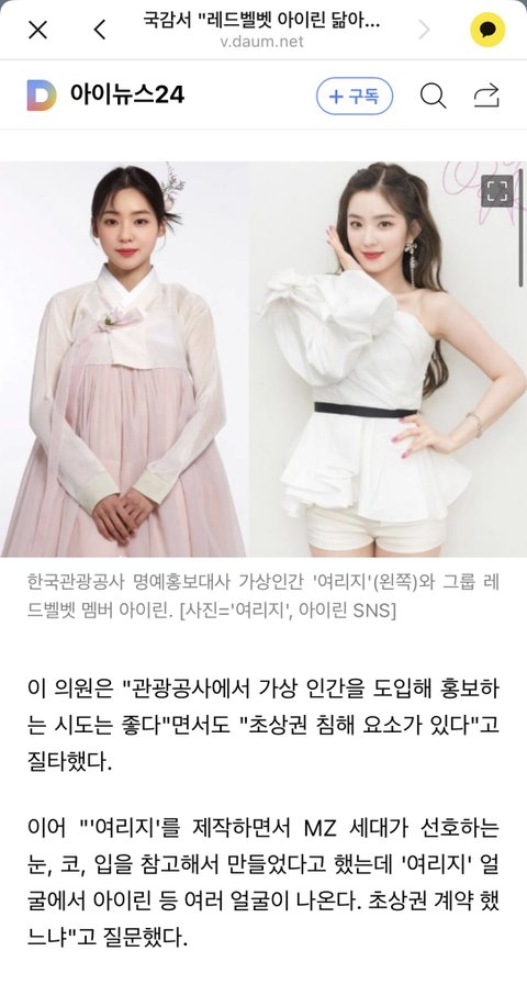 아이린 닮은 가상 관광대사 논란 어케생각하냐