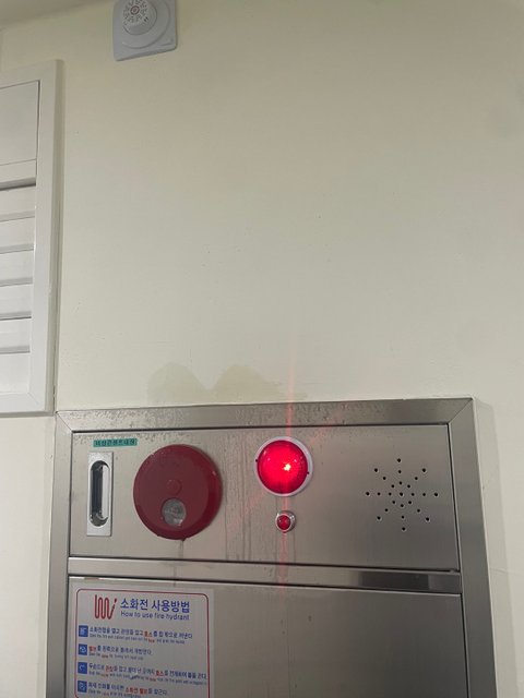 이렇게 소화전까지 물이 다 들어갔습니다. 당연히 관리실에 전화드려 "혹시 꼭대기 층 보셨나요? 천장에서 물이 새는데 확인해주세요" 라고 말씀드리니
