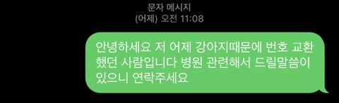 그리고 집가서 손 비누로 빡빡 씻고 잔다음에 다음날도 붓기 조금 남아있길래 피부과가서 얘기하고 주사 한대맞고 약처방 조금 받은 다음 교환한 번호로 전화했는데 안받아서 문자를 (안녕하세요 저 어제 강아지때문에 번호 교환했던 사람입니다 병원 관련해서 드릴말씀이 있으니 연락주세요)남겼어