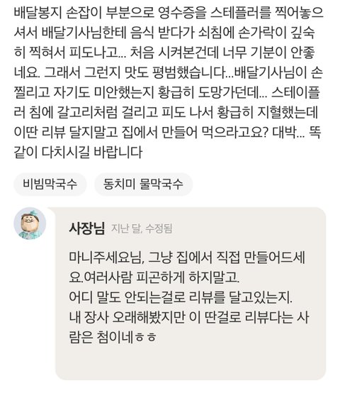 사장이 까칠은요. 기본도 안된작자구만. 배달료까지 따로 지불하는데 포장도 제대로 못하나요? 그게싫음 홀장사만 하면 될텐데 무슨 헛소리람?