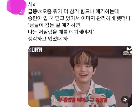 특히 이번에 선미 선배님이랑 같이 출연한 유튭 예능에서 급똥이랑 오줌 둘 중 뭐가 더 급한가에 대해 토론할때 미치는줄 ㅋㅋㅋㅋ