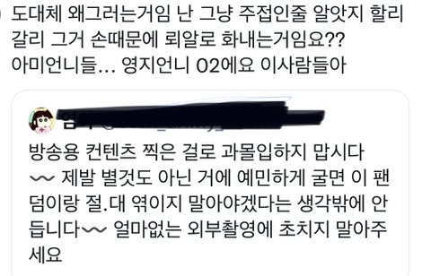 아줌마들 딸보다 어릴텐데 좀 작작해 전엔 분량없다고 방송사 테러하고 그러던데 제발 좀 내부에서 하는 짓 나가서 하지 말라고요