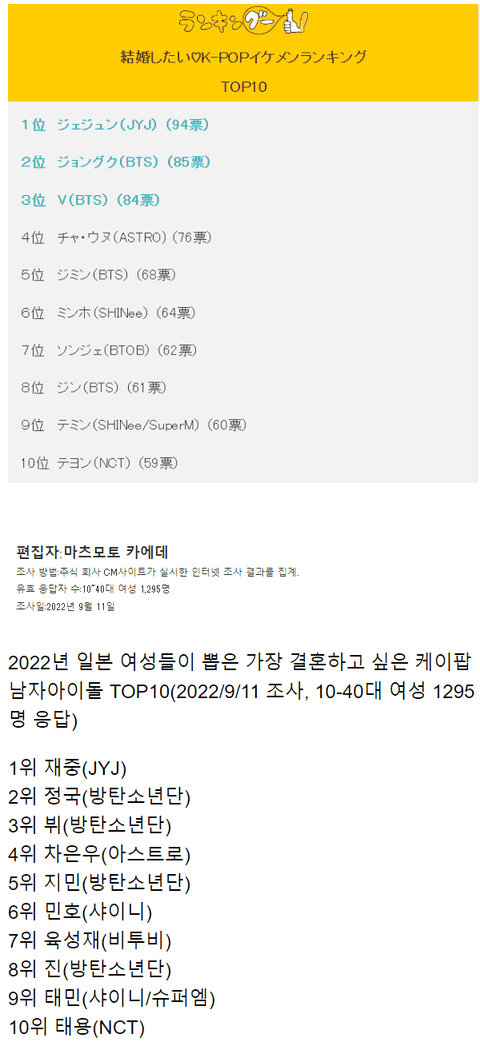 상식적으로 해외투표까지 들어갔는데도 줄 못세운거보면 진짜 일본인만 투표한거거나 아니면 방탄 해외인기가 개거품이거나 둘중하나임