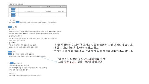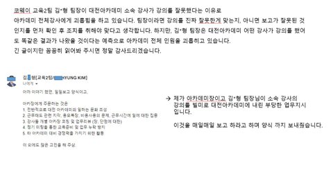 팀장이라면 강의를 진짜 잘못한게 맞는지, 아니면 보고가 잘못된 것인지를 먼저 확인 후 조치를 취해야 맞다고 생각합니다. 하지만, 김*형 팀장은 대전아카데미 어떤 강사가 강의를 했어도 똑같은 결과가 나왔을 것이다는 예측으로 아카데미 전체 인원을 괴롭히고 있습니다.