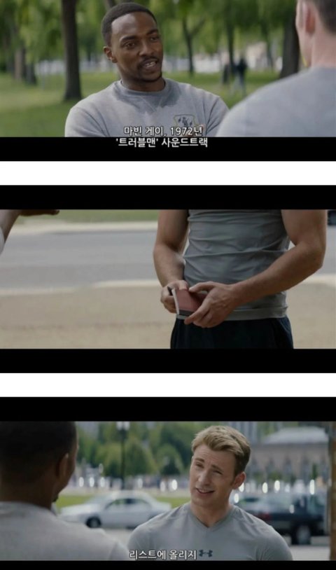 샘(팔콘)이 캡틴에게 노래 한 곡을 추천해 줌