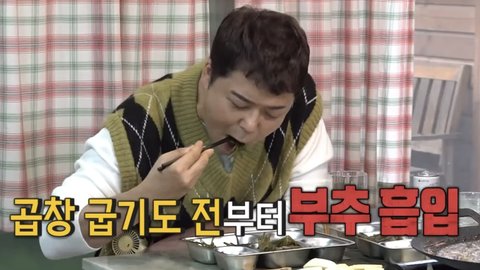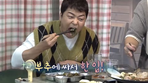 부추에 싸서 한 입 먹더니,