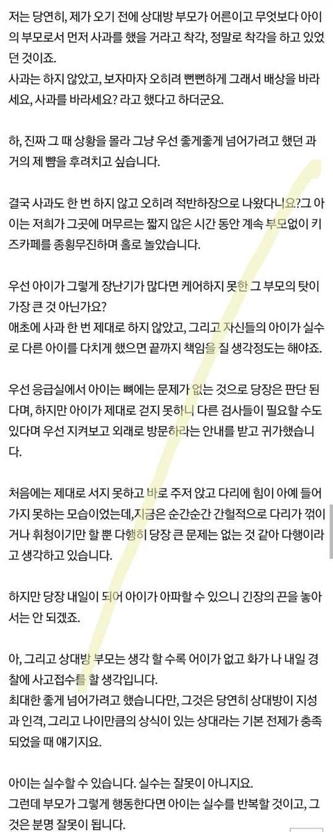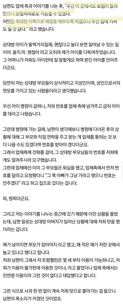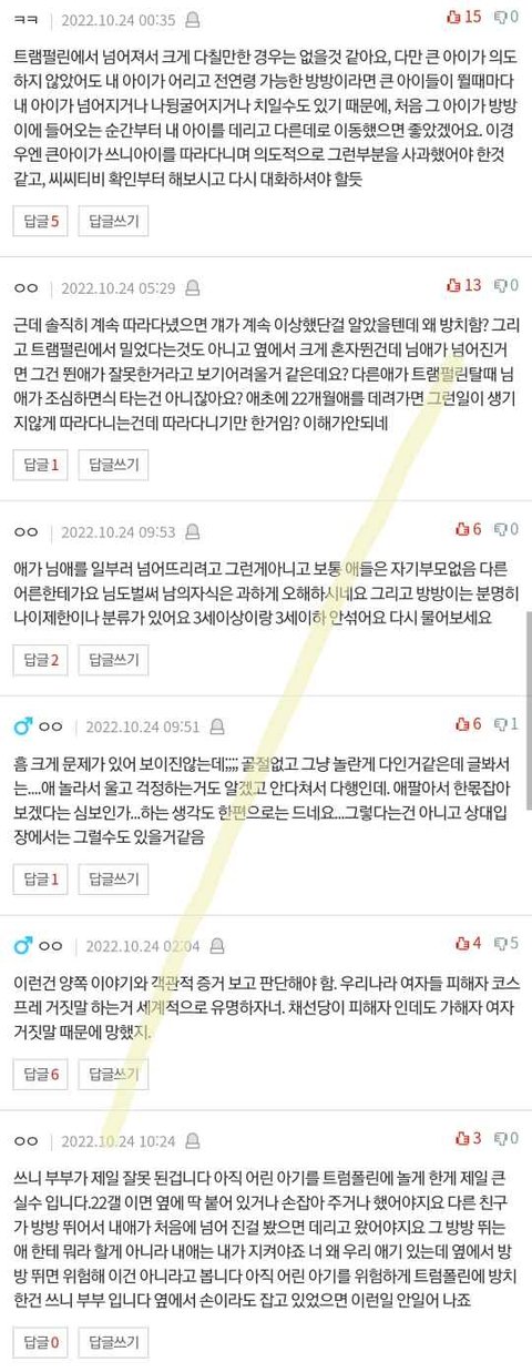 22개월이 트램펄린에 몸을 잘 가누겠음 ?? 부모가 따라 들어가야지, 4살 이상애들, 8살 이상애들 정신없이 뛰어다니는데 22개월짜리가 잘 서있을수있겠냐? ㅋㅋㅋㅋ 물론 옆에서 일부로 뛴애도 잘못이있지, 근데, 22개월 짜리 키카갔으면 적어도 쳐 앉아서 구경, 커피마실생각말고 따라다니면서 내새끼 봐야지? 안그래? 아님 키카를 가질말아야지 ㅋㅋㅋㅋㅋ