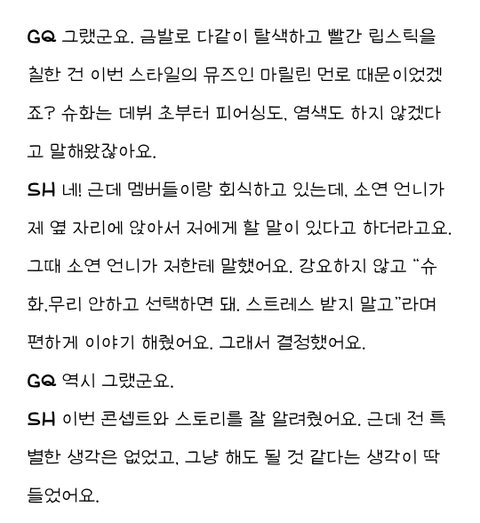 슈화 금발도 소연이가 절대 무리하지말고 안해도된다고 편하게 얘기했대.. 그래서 하기로 결심했다고 ㅋㅋㅋㅋ 슈화피셜: 제가 염색 하기 싫으면 대통령이 부탁해도 안 한다. 설득 그런거 없었고 내 선택이다.