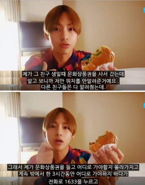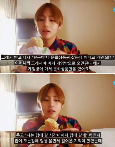 뷔가 초등학교 시절 친구에게 생일 초대 받고 문화상품권을 사서 갔는데 다른 친구들에게는 장소를 알려주고 뷔에게만 그 장소를 알려주지 않았대. 뷔가 약 3시간 뒤에 장소를 알아내서 게임방에 그 친구를 찾아가서 선물을 주고 집으로 돌아왔다고 했음. 서러워서 집에 돌아오는 길에 울었다고.