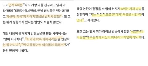 최근 뷔 안티이자 악개들이 학폭 루머를 조직적으로 작업해서 비방하려는게 폭로됐고, 이와 관련하여 몇몇 기사가 뷔가 학폭에 연류되었나?의 뉘앙스로 제목을 뽑아내는데 마치 이걸 루머처럼 퍼나르는 것같은 느낌 ㅠㅠㅠㅠㅠㅠㅠ