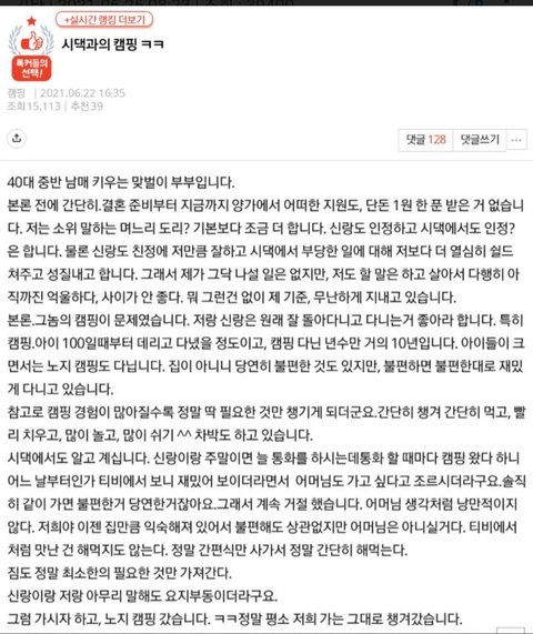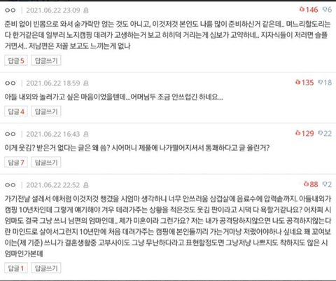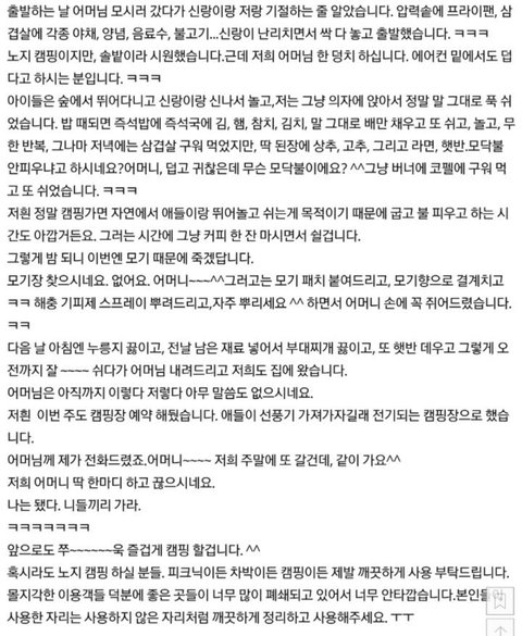 ㅋㅋ그냥 심사가 뒤틀려있는 사람이네. 나이 드신 부모님들 대부분 젊을 때 고생하시고 지금은 당연하게 누리는 것들을 누리는 방법을 몰라 못 누리시는 분들이신데 아무리 시부모라지만 캠핑의 매력을 느끼게 해 드리는게 얼마나 힘든 일이라고 나이드신 양반을 저리 고생을 시키고 그걸 또 자랑이라고.. ㅋㅋㅋㅋ