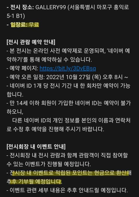 사진전 오면 돈 한 푼도 안 쓰게 할 거래 무료로 일주일동안 사진전하는데 전시장 내 이벤트 참여해서 모인 포인트는 현금으로 전환해서 기부까지 한대(=전시회 돈도 안받는데 기부하는것도 전부 사비털어서 한다는거)