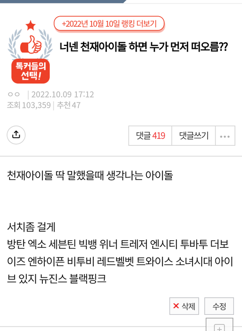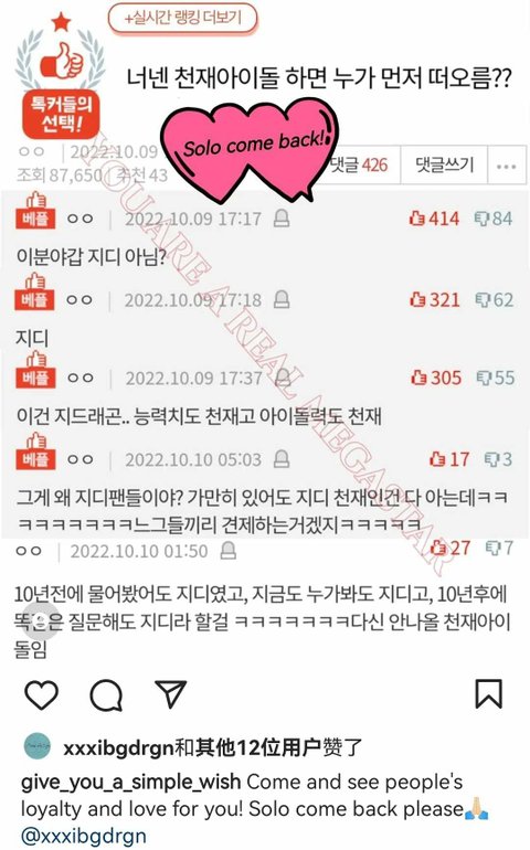 ㅈㄴ 니맴내맘 저 베댓중에 하나 난데 지디가 봐줬다고 자랑하고 싶은데 ㅜㅜㅋㅋㅋ유툽 댓글도 아니고 판이라서…자랑도 못하고ㅋㅋㅋㅋㅋㅋㅋㅋㅋㅋㅋㅋㅋㅋㅋㅋㅋㅋㅋㅋ