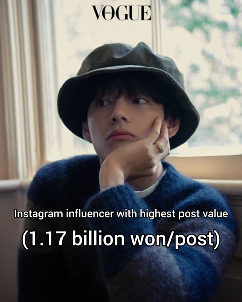 인스타그램 계정의 가치를 평가하는 소셜 미디어 오디터 업체 'Speakrj'에 따르면 뷔의 스폰서 포스트 추정 비용은 81만 4000달러(11억 7천만원)로 전세계 최고가다.