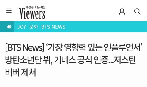 방탄소년단 뷔가 '가장 영향력 있는 인플루언서' 전세계 남자 가수 1위에 올라 막강한 소셜 파급력을 과시했다.