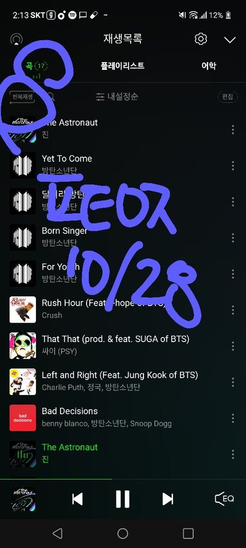 1. 재생목록 다 비우고 17곡 슴리 채우기