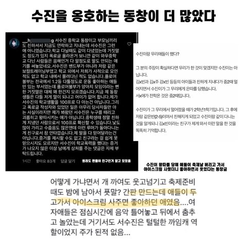 어디서 이게 작정하고 터뜨린거라는걸 봤는데 폭로자랑 수진이랑 놀다가 수진이 팽당한 무리랑 친구라는거 봤음 그렇지 않고서야 어떻게 자기 뺨때리고 왕따 시킨 애들이랑 고딩 때 페북 태그하면서 놂??ㅋㅋㅋ 수진은 학폭 아니라는걸 증명하고 싶어도 팽 당한 무리 말고 졸업 전까지 같이 다닌 중학교 친구가 딱 한명인데 그 사람도 폭로자랑도 친구라 애매해져서 뚜렷하게 사건에 대해서 증언해줄 동창이 없는거같은데.. 애초에 그 동창도 서신애 전학 왔을때 수진 이미 팽당하고 자기랑 다녔고 뒷담화 한적도 없다 그랬음. 그리고 그냥 적당히 친했거나 안친했던 동창들이 인터넷에 인증한걸로는 옹호글이 훨씬 많았는데 사람들이 이런건 관심이 없더라 참고로 난 넵랜도 아니고 수진팬도 아님 인증 바라면 댓글에 할게 걍 최초 폭로글부터 계속 봤던 사람이야. 지금 생각해보면 진짜 걍 애들 싸움이었을거 같음. 근데 이제 수진이 다니던 무리랑 폭로자가 짜고쳐서 작정하고 터뜨렸는데 서신애는 거기에 계획적인지 아닌지 모르겠지만 거들었다가 결국 말 바꾸기 한거 보면….ㅋㅋㅋㅋㅌ 서신애도 폭로자랑3학년 때 같은반이었다 하고 걍 중딩 애들끼리 서로 기싸움 하고 애들끼리 싸웠던 정도를 여러명이서 수진 나락 보내려고 작정하고 말 맞춘 느낌;
