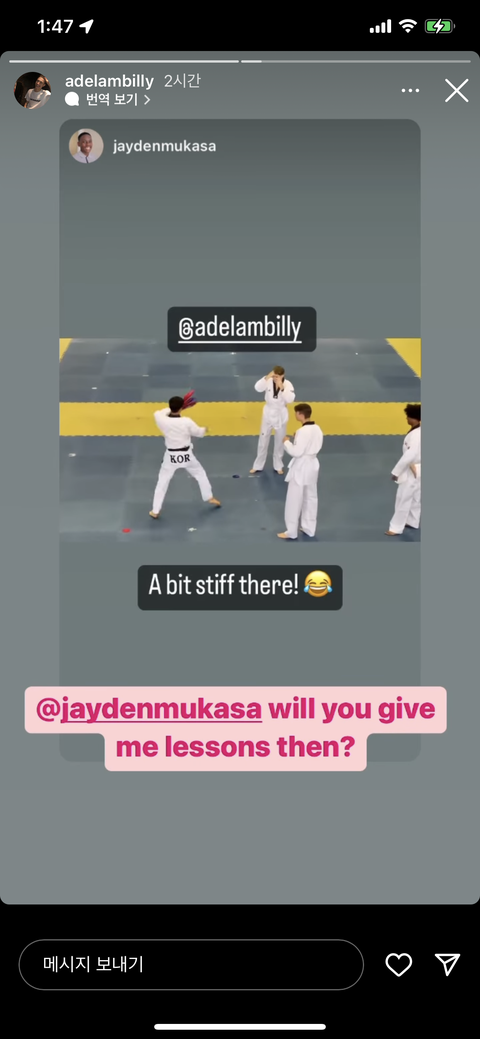 제이든이 뻣뻣하다니깐 르망이가 스토리로 그럼 레슨해줄래? 답장했음 ㅋㅋㅋㅋㅋㅋ
