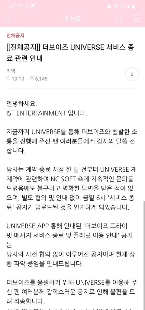 이거 너무함 갑질이지 저게 소비자를 뭐로 보는거임? 다른 그룹들은 해지돼도 이전까지 보낸건 읽을 수 있게 해줬다매 왜 여기만 안됨...?뭐 이전에 보낸거라도 캡처해서 저장 가능함...?(그거 된다고 괜찮다는 뜻 아님 그거라도 돼야 팬들이 가지고 있지)그리고 더보이즈쪽은 계약연장 하려고 한 것 같던데 저 회사에서 무시하고 그냥 일주일 후 끝이라고 공지한거라며 그게 무슨 소리인지도 모르겠고 환불은 당연히 해줘야지 누가 일주일보려고 결제함?그리고 그걸 미리 알린게 아니잖아 알려준 다음에 알고 결제한 건 자기선택인데 그것도 아님..더 웃긴건 누가 자기돌도 아닌 타돌 유니버스 결제함ㅋㄱㅋㅋ환불은 당연한거지 소보원 신고ㄱㄱ
