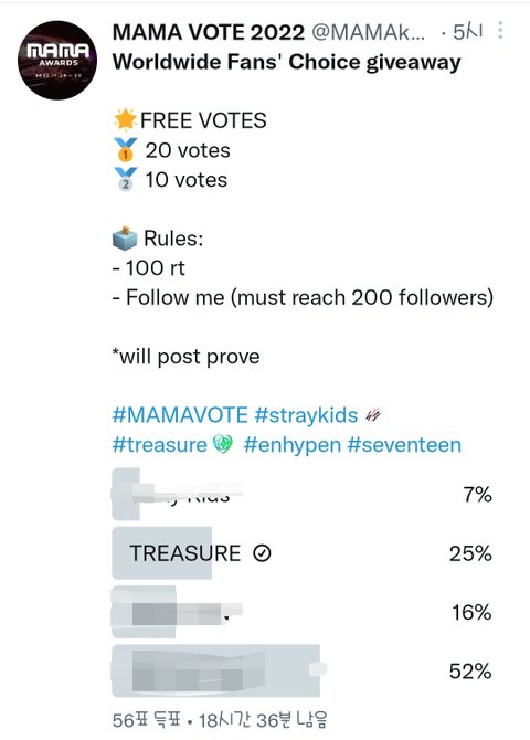 트윗에 WORLDWIDE FANS' CHOICE VOTE GIVEAWAY 검색하고 트레저나오는건 전부다 투표해줘