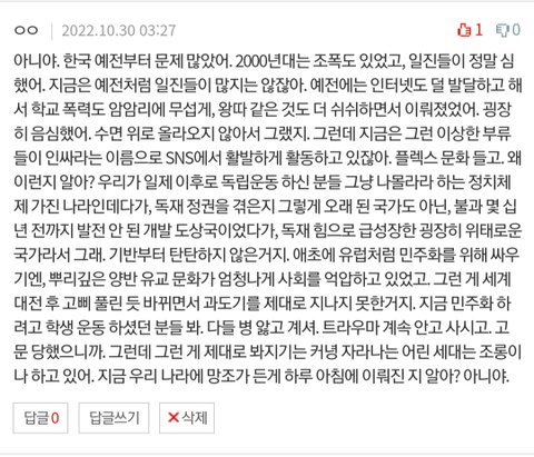 진심 사람들이 점점 이상해짐 익명이라고 할말 못할말 구분 못하고 글 막 싸지르고 ㅋㅋㅋㅋㅋ 지금도 네이트판 다른 게시글 가보면 놀다죽은건데 애도 왜하냐 ㅇㅈㄹ하는 댓글들 완전 많음;;; 그냥 ’깨어있는나‘에 취해서 지들딴엔 옳다고 생각하는 댓글 쓰는 것 같은데 정신 차렸으면 좋겠음 아직 사고 발생한지 25시간밖에 안지났고 154명이 한꺼번에 죽은 사건임 이 시기엔 잘잘못을 떠나서 애도하는게 맞음