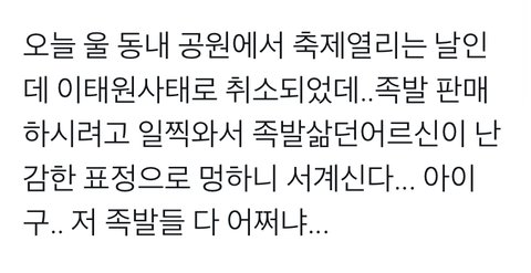 11시 행사라서 이미 아침부터가서 족발삼고 준비했는데 10시27분에 시에서 행사 취소 문자를 보냈대ㅠㅠㅠ 새벽에라도 알려줬으면 상인분들도 피해를 덜 입었을텐데 참사 안타까운것과 별게로 저분들도 먹고 사셔야하는데 무슨죄야ㅠㅠ