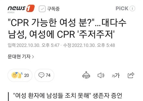 저거 블라인드 썰 하나 나온거로 기자가 가져다 올린거라 신뢰성 1도 없음 검증안된거임ㅋㅋ 오히려 cpr영상에 남자들 여럿이 여자 cpr하는거 많이 찍혔는데 꼭 여자들아빼애액이 하고싶은 찐따야갤남들이 몰아가려고 저거 퍼트리더라ㅋㅋㅋ
