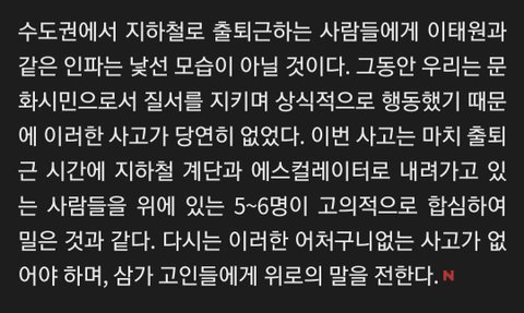 얘들아 뇌가 있으면 생.각.좀.해. 저 사람들이 저럴줄 알고 들어갔겠냐? 사람 죽을만큼 틈도 없는데 어떻게 들어가는데?? 내가 들어갔는데 뒤에서도 사람들이 왔고 나는 이미 골목에 들어온 상태고 나가려고 해도 오도가도 못하는 상황이잖아. 상식적으로 죽을만큼 틈이 없는데 어떻게 들어가??? 운이 좋아 니들도 지금까지 살아있는거지 이건 누구나 당할 수 있는 사고라고.
