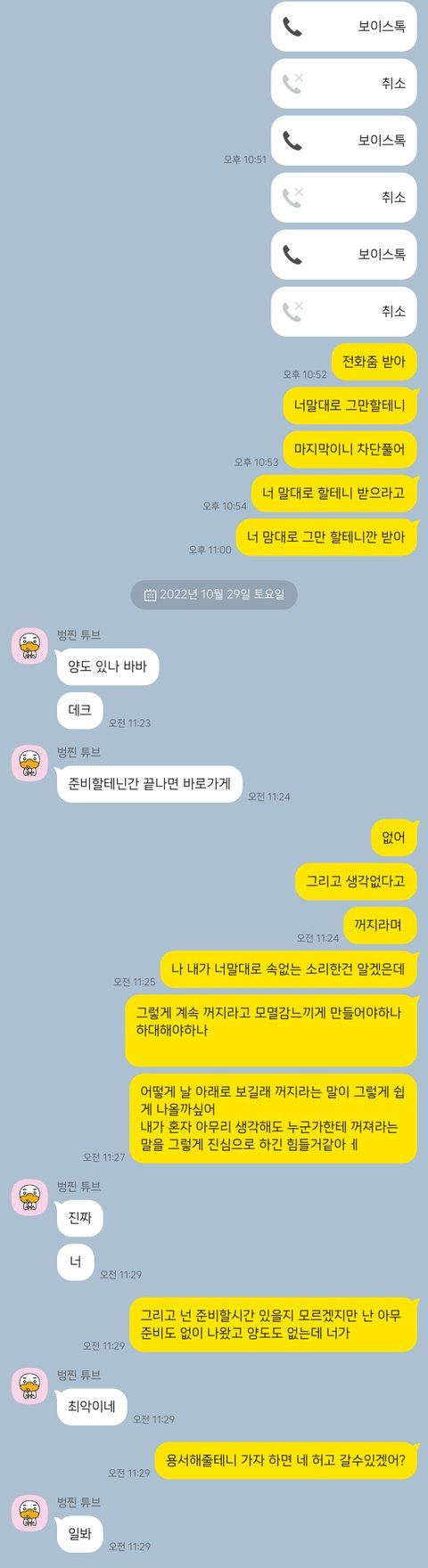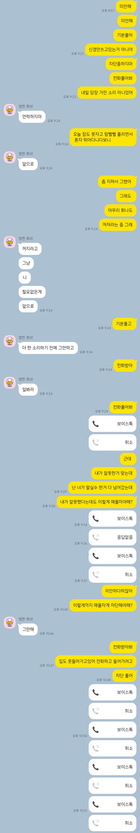 근데 계속 꺼져라하고 차단하니 내가 그정도로 잘못한건가 모멸감이 들어서 아직까지도 상처가 큽니다.