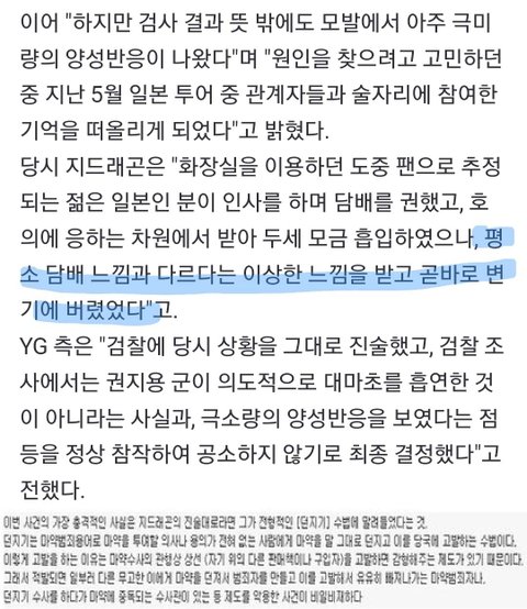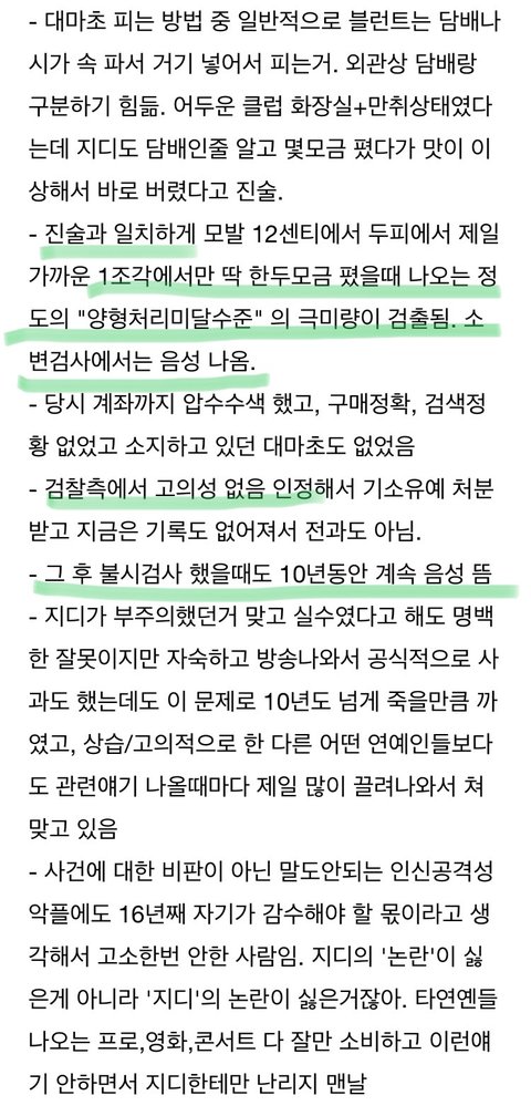 지디는 담배랑 대마초인걸 구분하지못했다고 안했음~ 피우기전에 '외관상' 구분못했다고한거지 피우고나서는 독해서 바로 버렸다고 진술함. (개인적생각으로는 담배안에 대마초를 섞어서 건넸을거라고 추정함) 일반적으로 대마초가 흔한나라였다면 의심할수도 있었겠지만 대마초가 흔한나라도 아니었고 냄새를 맡아본적이 없어서 거기까지 생각을 못한거지, 만취상태에서도 일반담배는 아닌거 알았어서 버렸다고 말했음. 그리고 딱 두모금분량의 양성반응만 나왔고 모발 12조각중 1번째 조각에서만 양성반응이라 초범인게 100퍼센트 확실했음ㅇㅇ 안그래도 약쟁이들이 일반인한테 마약 몰래먹이는것들 톡선에도 여러번 올라왔으면서 지디는 무조건 약쟁이어야하지???ㅋㅋ 어그로들이 흡연자가 담배랑 대마초 구분못하냐고 ㄱㅅㄹ할것같아서 미리말함