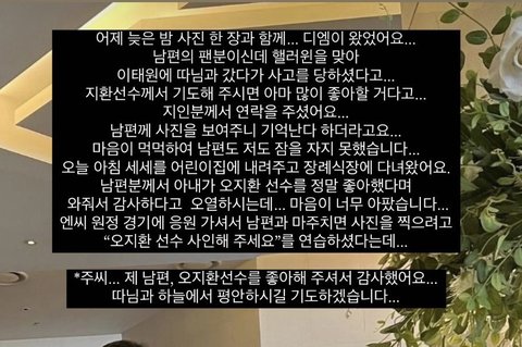 여자 분이 LG 오지환 선수 팬이셨는데 딸이랑 이태원 갔다가 사고당하셔서 지인 분이 살아있을 때 팬이었다, 기도해주시면 많이 좋아할 것 같다고 디엠 보내셨대 그래서 애기들 어린이집 보내고 장례식장 갔다왔다고함...