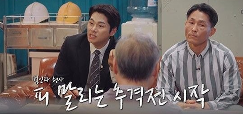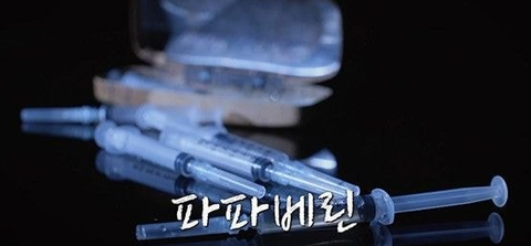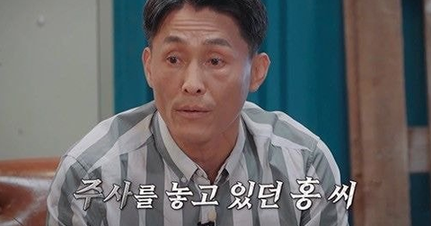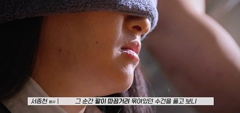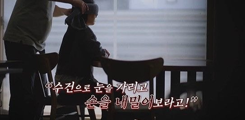 수건으로 눈을 가리고 팔에 주사를 놨음