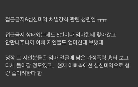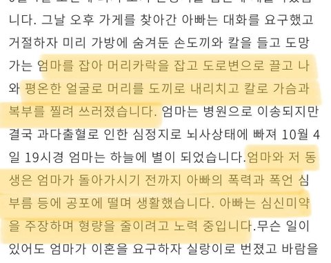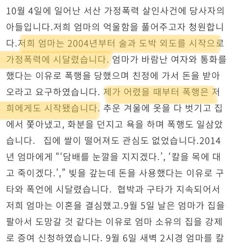 ‘엄마는 평생을 저희를 위해서 살아오신 은인입니다. 엄마 가시는 길 편하게 보내드리고 싶습니다. 아빠가 죗값 치를 수 있게 도와주세요. 간절히 청원합니다.’