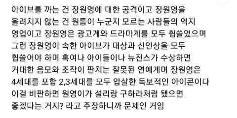 그리고 장원영 안티들이 간과하는점 : 지들이 죽도록 패는 장원영 팬덤보다 본인들 정신병이 훨씬 심각하다는 점 ㅋㅋㅋㅋㅋㅋ