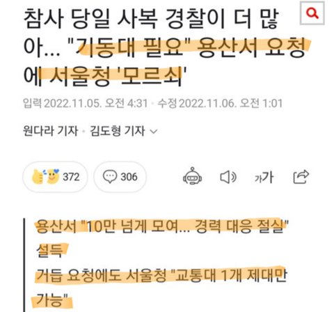 전문가들은 인파통제의 부재가 이번 사고의 원인이라고 입을 모아 말하는데, 인력을 배치해서 사고를 예방할 수 있는 권한을 가진 윗선들이 일제히 책임떠넘기는거 보니 너무 화나요 진짜!ㅠ