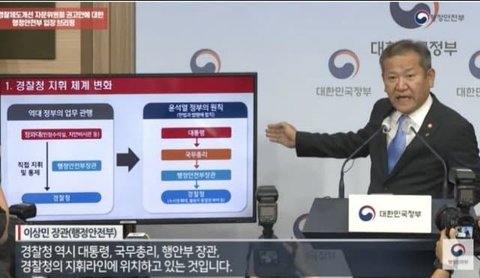 우리나라의 국가기관에는 입법부 사법부 행정부가 있습니다. 대통령은 그 중 행정부의 수장이며, 경찰청은 행정부의 각 부 중 행정안전부의 지휘를 받는 하위기관입니다. 아래 이상민 행안부장관의 발표처럼 경찰청의 자세한 지휘 라인은 다음과 같습니다.