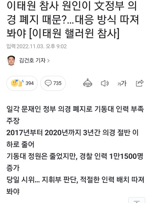 2️⃣ "문재인이 기동대 인력 줄여서 이렇게 된거다" 라는 댓글이 있어서 덧붙입니다. 기동대 인력 절반으로 감소하는 동안 경찰 정원은 15000 늘었습니다. 의경부족이 아니라 인력배치의 문제임을 지적하는 기사입니다. https://n.news.naver.com/article/022/0003750768?sid=102