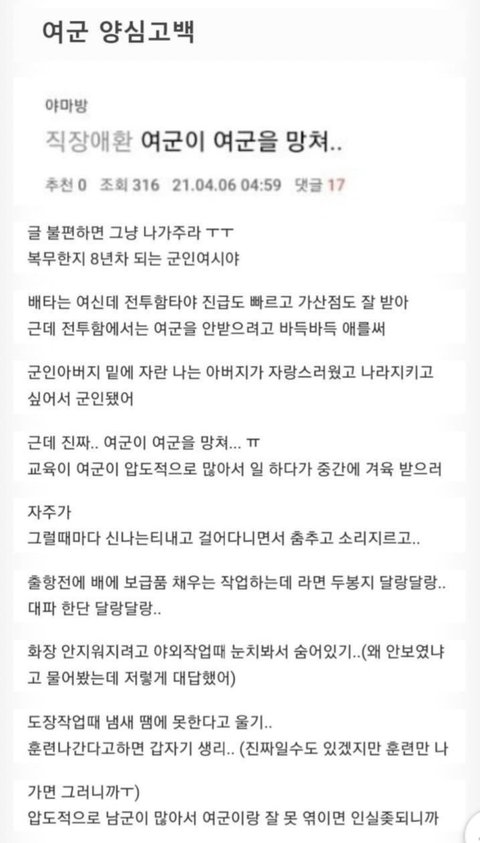 이거 좀 주작내 나는데? 직장 다니는 여자들도 생리휴가 거의 안 쓰는데 여군만 생리핑계를 잘 댄다고? 그리고 그냥 대학생만 봐도 저 글에 나오는것처럼 화장강박 심하지 않은데 외모랑 상관없는 직업 가진 여군들이 화장강박이 심하다고? '여시는 여자만 가입 가능하니 주작 못하니 않냐'고 할수 있는데 여시에도 여혐하는 남자들 가입해서 주작질함 여시에 한국여자가 외국남자 만나면 이혼한다는글 쓰고 혼자서 동조댓글 엄청나게 달면서 자아분열하는 사람 있었음 여시 자아분열글 털리던 시기에 그 글까지 같이 털림