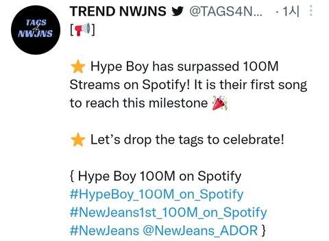 Hype boy 스포티파이 1억 스밍 돌파!