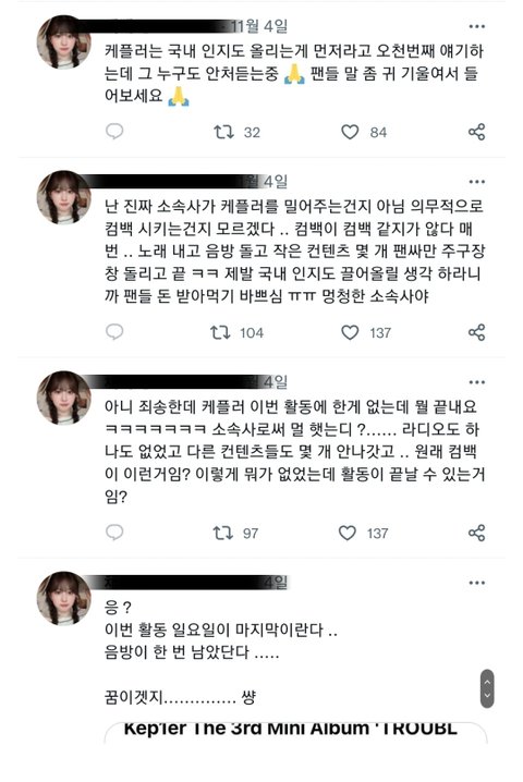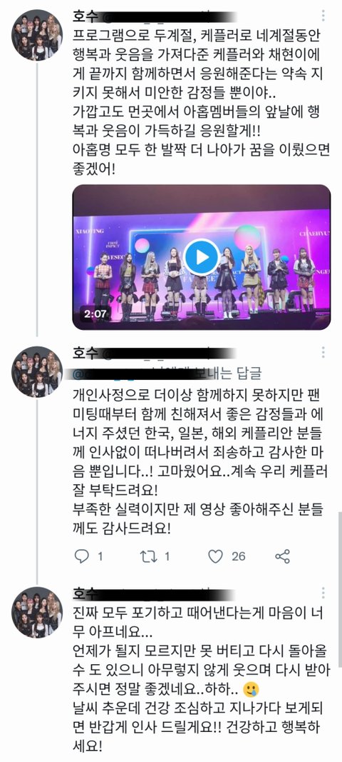 나도 딱 이번 활동으로 덕질 마무리한 케플리안인데 가장 큰건 연애걸린멤 때문임... 소통앱에서라도 미안하다고 피드백이라도 해줬으면 괜찮았을텐데 없었던 일인척 오히려 더 뻔뻔하게 나와서 그냥 탈덕하게 됨. 연애하는게 왜 사과할 일이냐고 묻는 사람들 있을까봐 말하는데 팬들한테 데이트했던 날, 커플템 공유하며 기만한건 잘못 맞다고 생각해.