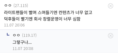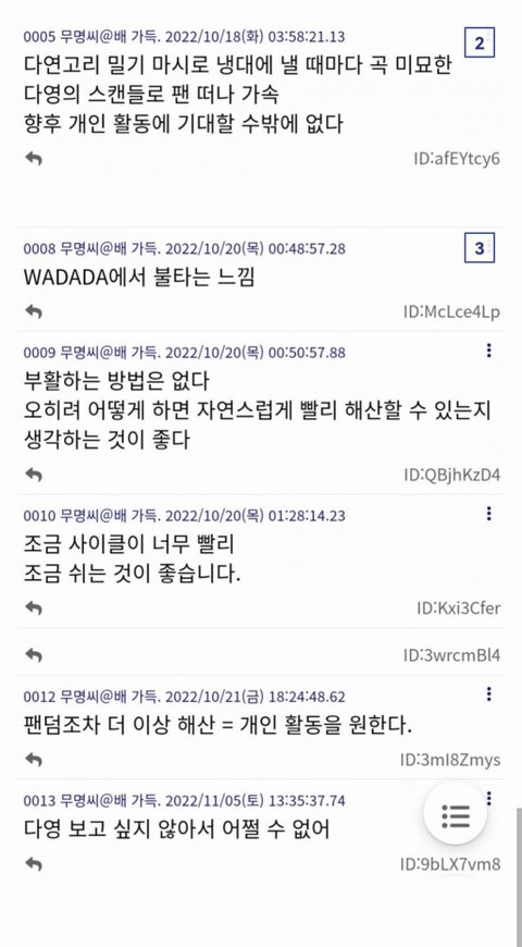 민폐멤 한명때문에 나머지 멤들은 뭔죄임 개불쌍함 재데뷔멤만 두명이고 민폐멤 본인도 오디션 재도전자면서 책임감이 없음 ㅋㅋ 마시로 좋아했어서 드디어 풀리나 싶었는데 에효.. 하필이면 그 민폐멤 파트는 개많아서 무대도 못보겠음