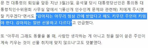 윤석열 : 강아지는 아무리 정상 간에 받았다고 해도 키우던 주인이 키워야 한다. 강아지는 일반 선물하고 다르다. (키워주세요 X)