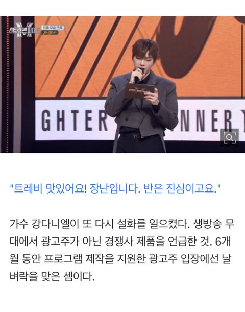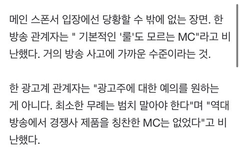 조금... 본인도 그렇고 아티스트쪽 스탭들도 그렇고 자각할 필요가 있을 거 같음 저건 실수라기 보다 사고야...PPL로 받은 비용으로 프로그램 제작도 하고 본인 출연료도 나오는건데 출연료 토해낼것도 아니고... 광고주가 문제 삼으면 어쩔? 매번 말실수로 문제 생기는데 조금 위태로워 보임