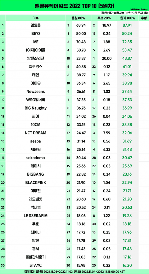 방탄 음원순위는 고작 18위였는데 투표점수로 5위면 투표 20%가 음원 80%를 이겨버리네 멜뮤도 투표로 장난치는거지 주작 그만하고 음원 성적대로 줘라