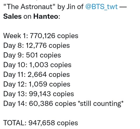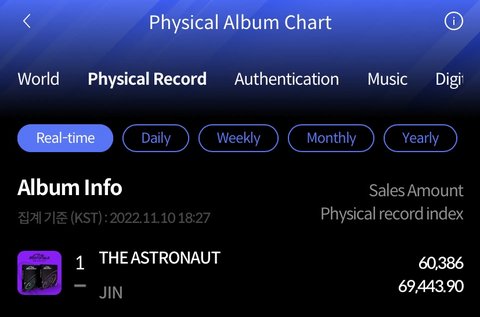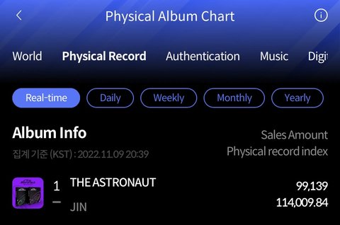 세계에서 제일큰 음판 시장인 일본 미국 판매량이 초동기간 끝나고 배송이라 초동기간에 집계안됨 이제터진 16만장도 일본물량이고 미국 영국물량은 12월배송이라 아예 집계되지도 않았음 1~2만장 터지는거면 말을 안하지 한터 초동이 77만장이었는데 일본 집계되니까 일주일만에 94만장된게 ㄹㅈㄷ 기록방해 미쳤음