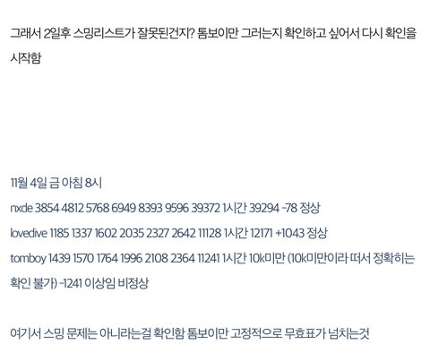 다이브들 주장대로 아이들 팬들 스밍이 문제면 누드 스밍도 같이 누락이 돼야 되는데 톰보이만 심각하게 비정상적임 < 이줄 읽고 댓글 달아 좀