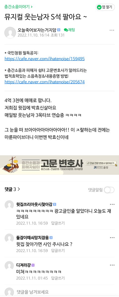 자취방 윗집돌대갈싱싱년 발바닥 탭댄스 진동 서라운드 페스티벌 뮤지컬 관람권 2억에 산 거 같아ㅜㅜ 공연 취소 안 될까?:)