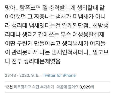탐폰 쓸 때 느낀다고 하는 애들은 지들 실ㅈ인거 인증하는 꼴밖에 더 되누ㅋㅋㅋㅋㅋㅋㅋㅋ 안쓰럽다 안쓰러워…