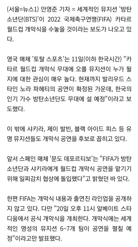정국이 카타르 떡밥도 아직 안 풀렸고, 개막식 선다는 썰도 [공식]만 안 붙었지 계속 보이는 듯 ㅋㅋㅋ 군읍읍 때문에 좀 긴가민가했는데 계속 기사나는 거 보면 ㄹㅇ 가나…?? 가져온 링크 말고도 현지매체에서도 계속 보도함 https://v.daum.net/v/20221111164226712