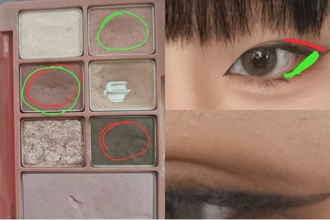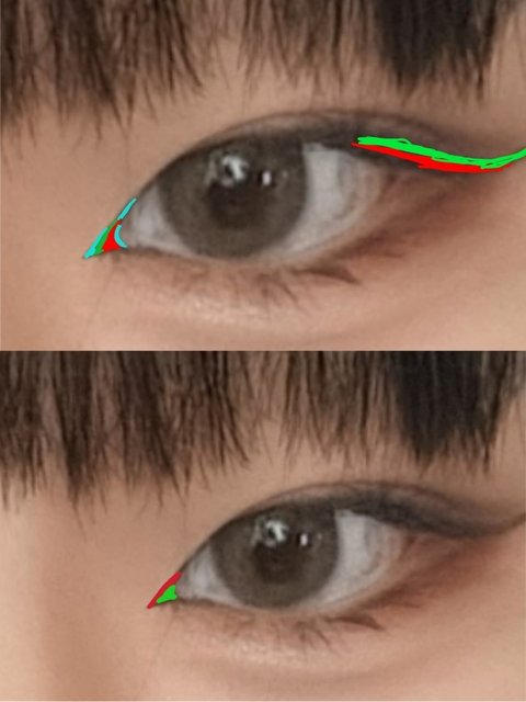 ♥︎그다음 아이라인도 빨강 초록 슌인데 먼저 빨간색처럼 내 라인 따라 내려줬다가 내 쌩얼 보면 알다시피 뒤쪽 쌍커풀이 확 두꺼워지는 속쌍이야 그래서 눈이 더 동그랗게 보이는 경향이 없지않아 있는데 초록색부분처럼 뒤쪽을 눈이 동그랗지 않고 길어보이게 채워준 다음 라인 따라 내려갔다가 살짝 올려 그려줘 내가 고양이상을 좋아하는데 눈꼬리 부분에서 바로 라인을 올리면 눈 확 짧아보여서 저렇게 해줘!!